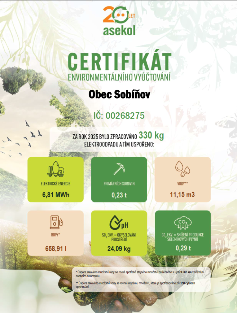 Certifikát enviromentálního vyúčtování pro obec Sobíňov