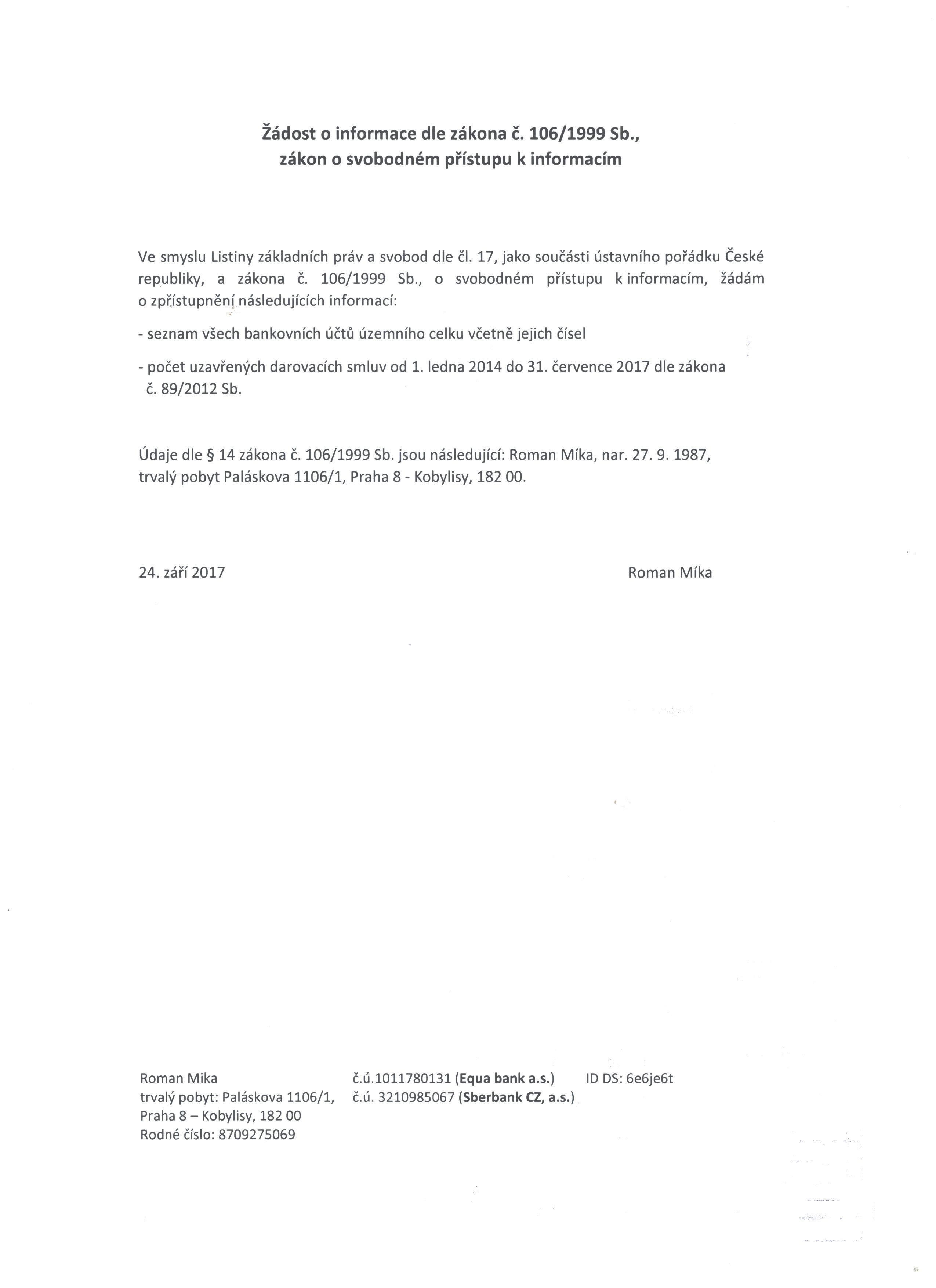 Žádost o poskytnutí informace 24. 9. 2017